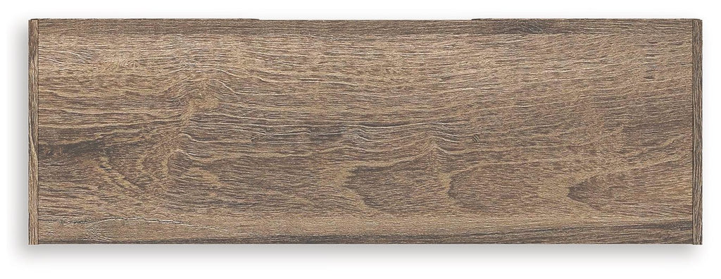 - Weathered brown finish over replicated oak grain with authentic touch