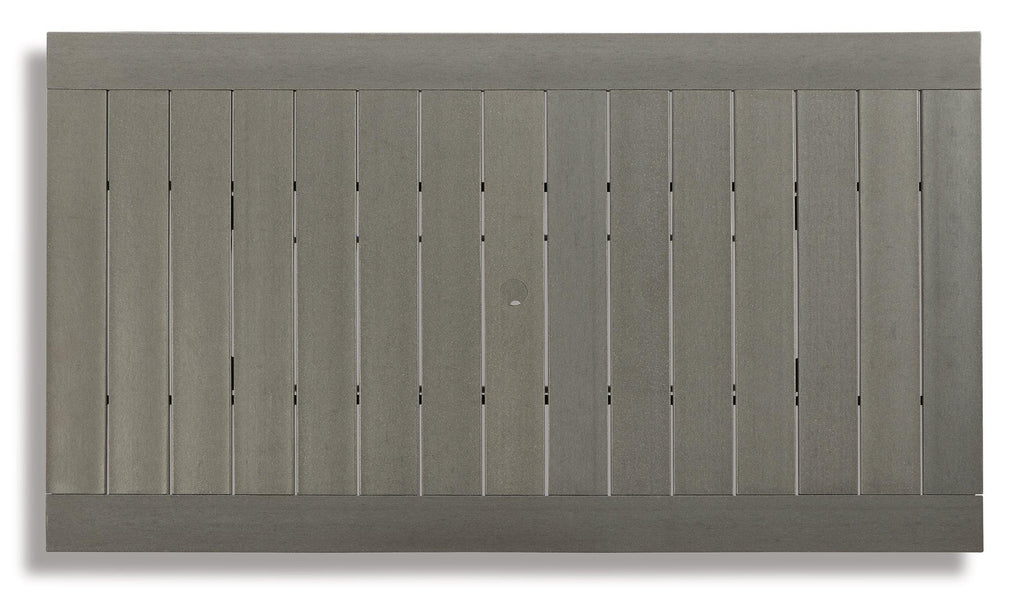 It’s the dawn of a new day for gray. Embrace the style trend with this outdoor dining set. Each piece is crafted of HDPE material, combining the exceptional durability and weather resistance you need with the ‚Äúwood look‚Äù you love. The rectangular table and comfortably cushioned chairs take alfresco living to a whole new level. A slatted table top infuses a plank-style, farmhouse-inspired touch and naturally sheds rainwater. Rest assured, the thick seat and back cushions on the chair are wrapped in Nuvella® high-performance fabric that’s fade-resistant, stain-resistant and a breeze to clean.