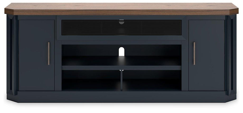 This TV stand combines casual contemporary design with modern appeal. Its combination of a thick-bodied wood-tone top with a slate blue cabinet is a smart choice on so many levels. Stow away electronics in the roomy cabinets, and use the upper shelf to conceal a soundbar speaker for a clean integrated look. Enhancing the experience: the optional fireplace insert (sold separately) brings a touch of warmth and beautiful ambiance to your living room.